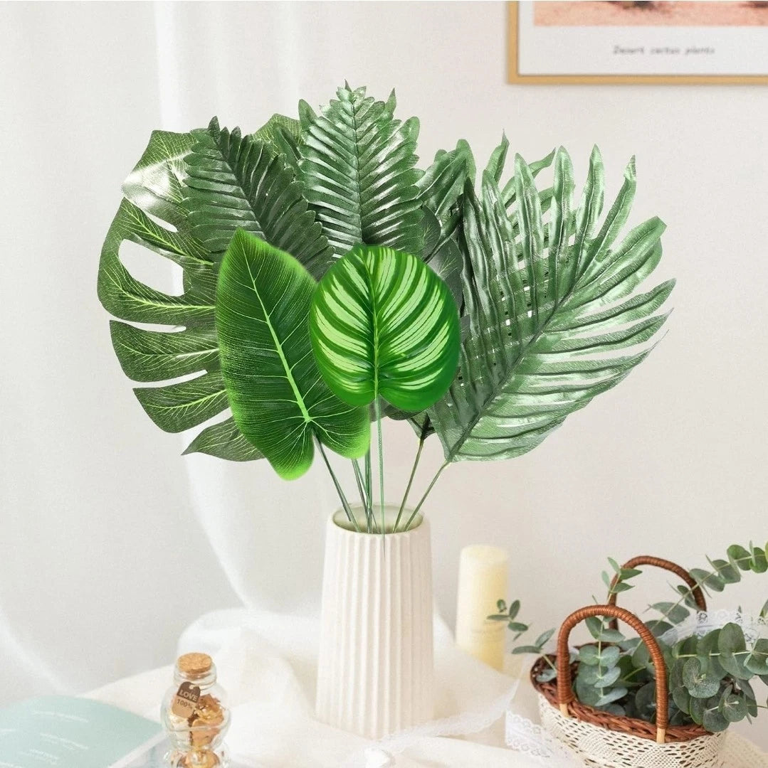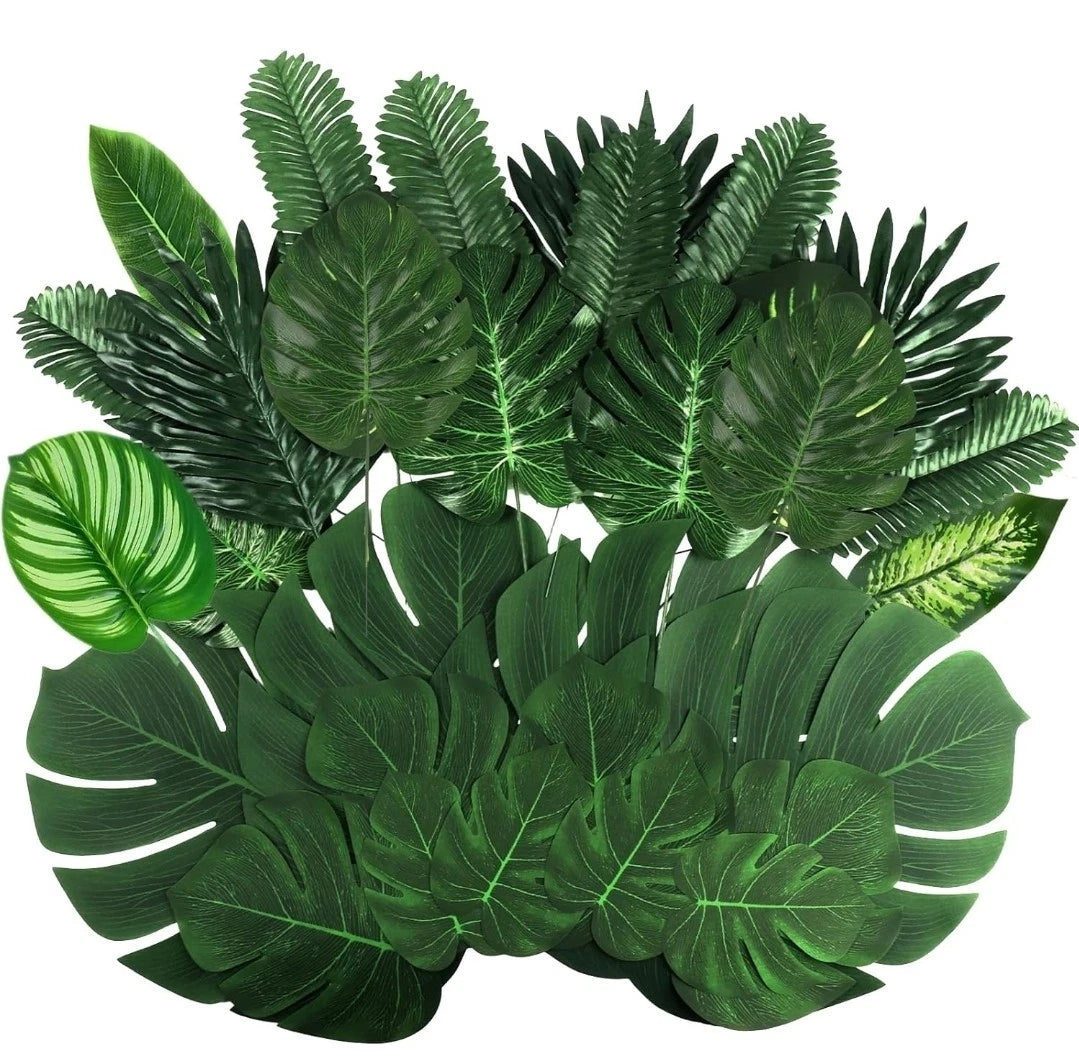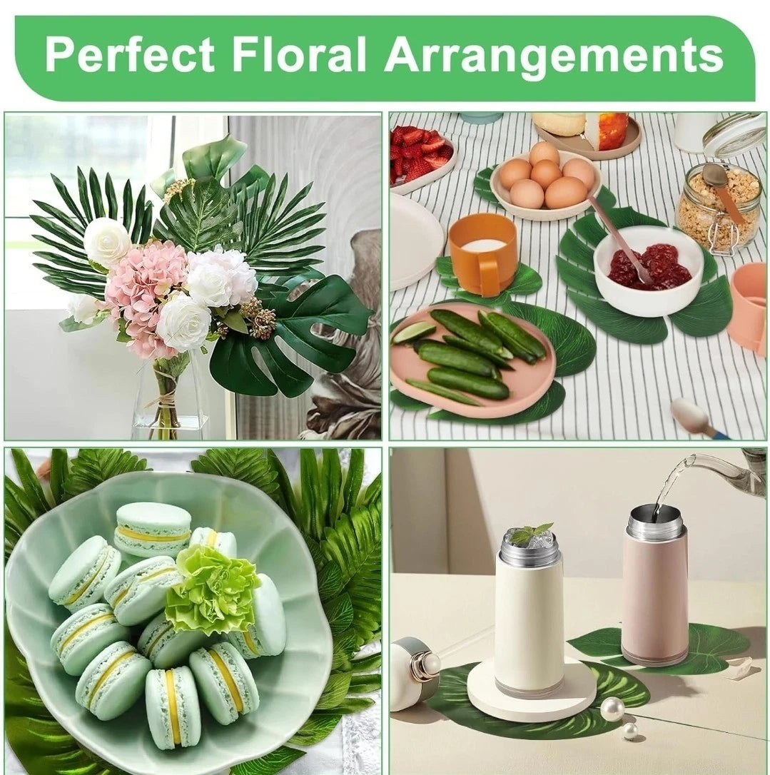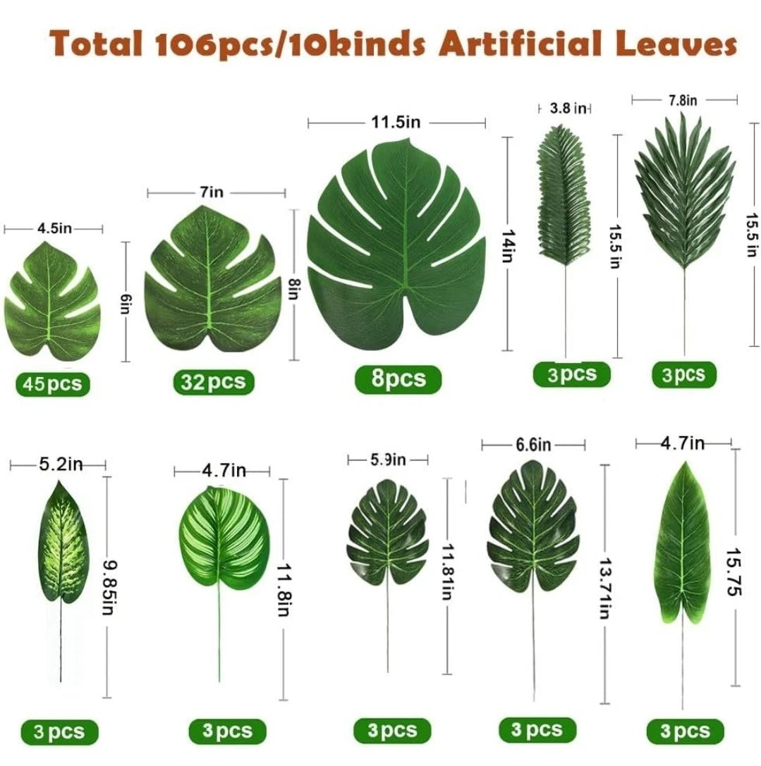 - Bring the lush beauty of the tropics to your events or home with this 106-piece set of artificial palm leaves. Made from high-quality faux silk, these realistic tropical leaves are durable, reusable, and eco-friendly.