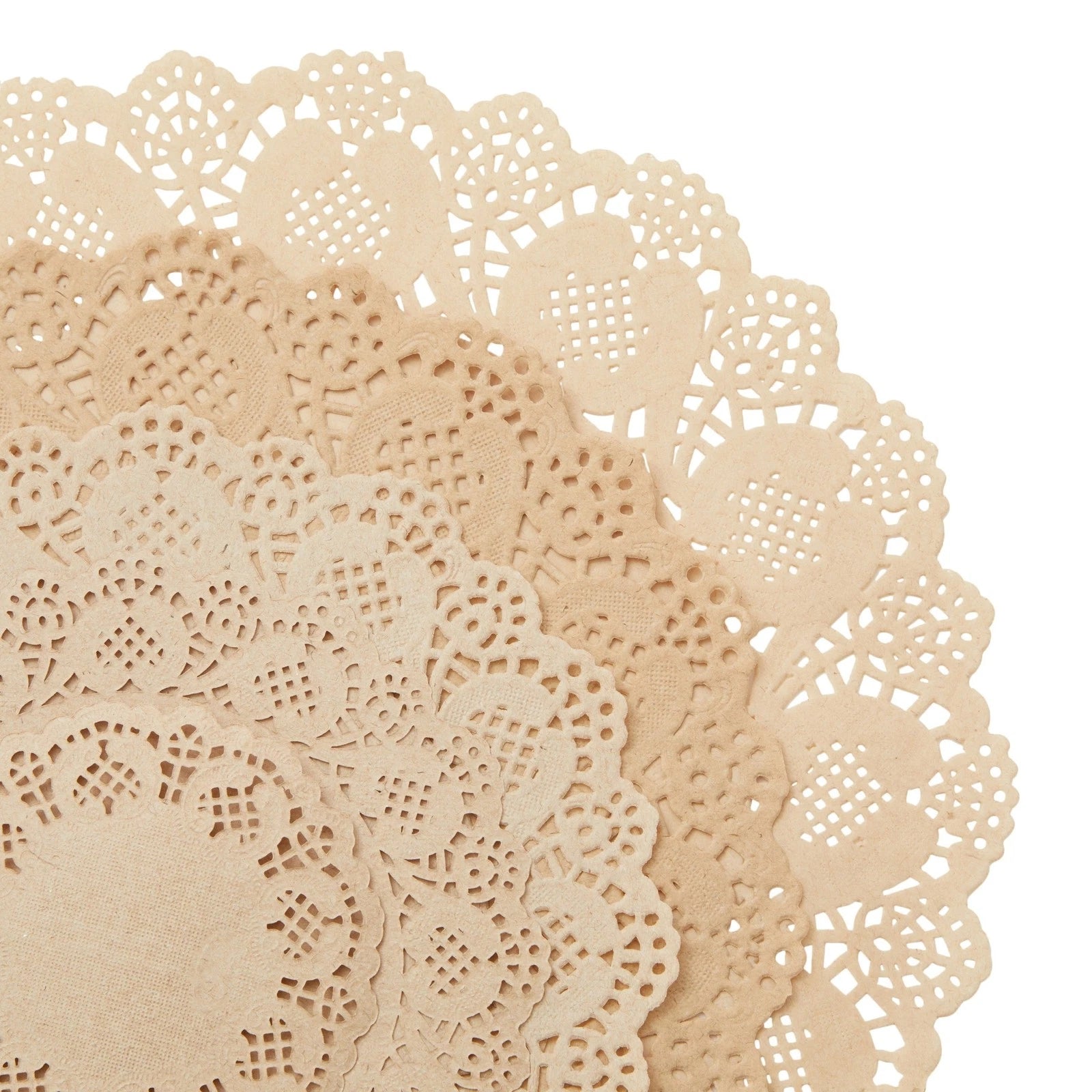 This bulk pack includes 250 round paper doilies in assorted sizes:
