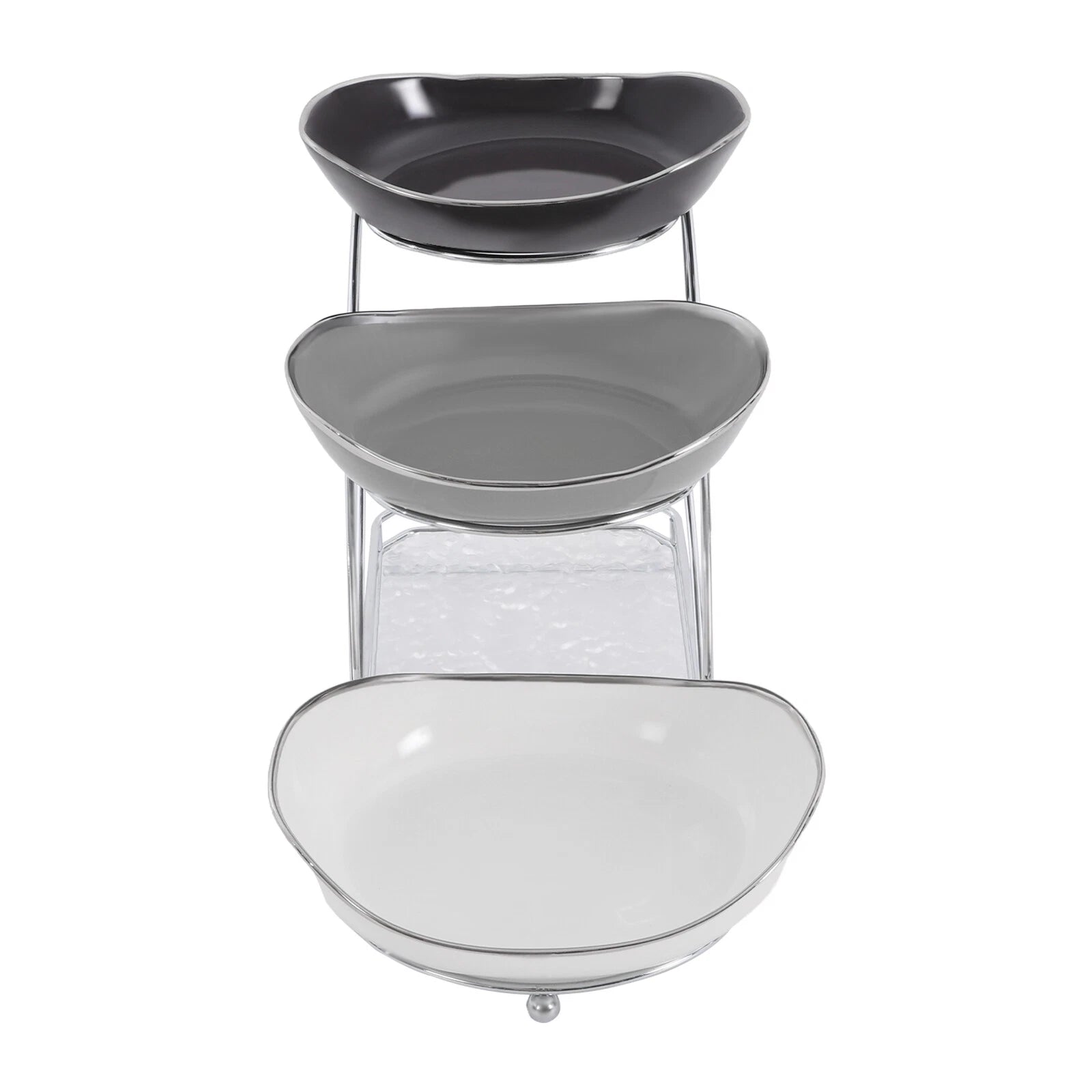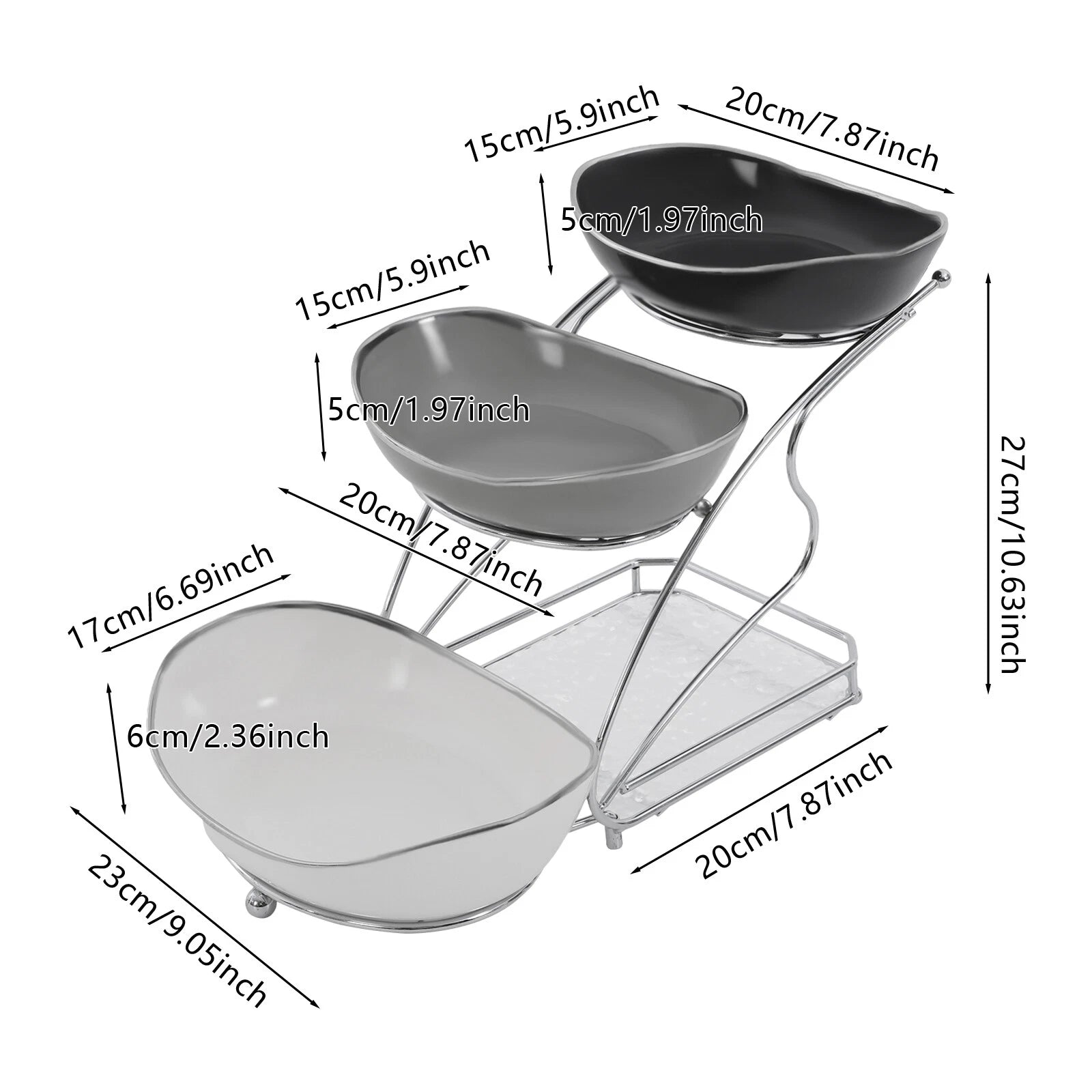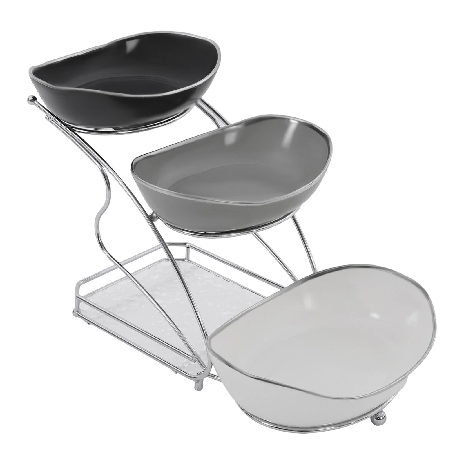 Featuring a glossy silver stand paired with elegant ceramic bowls, this serving set adds a touch of modern sophistication to any kitchen or dining area. -