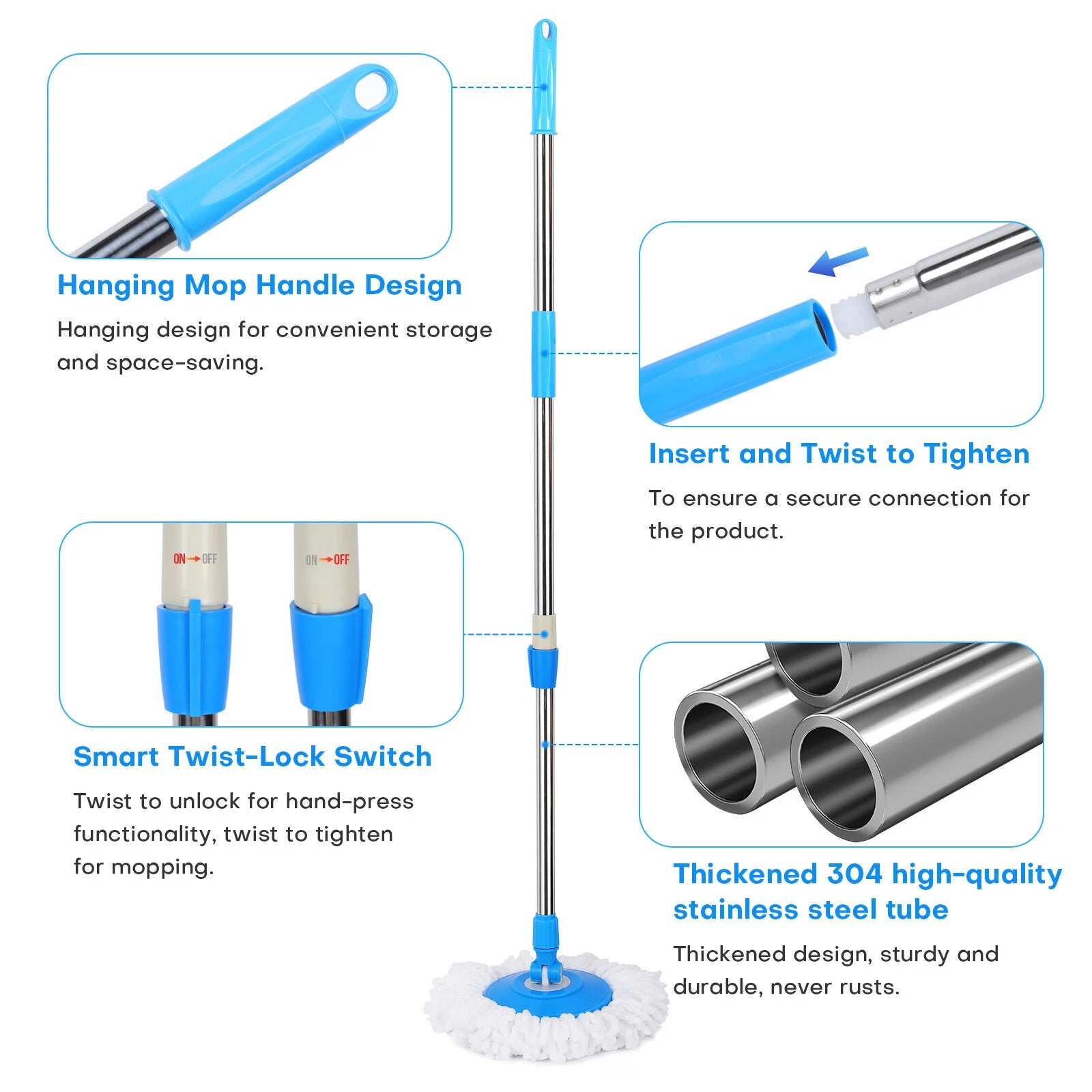 Made from upgraded stainless steel and sturdy plastic, this spin mop handle is designed for long-lasting use. Paired with soft microfiber mop heads that are gentle on all types of floors, it offers a reliable cleaning experience. -