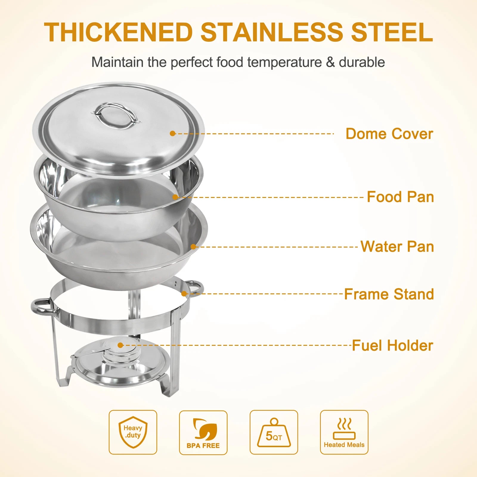 Includes 1 food pan, 1 water pan, 1 lid, 1 fuel holder (alcohol furnace), and a durable stainless steel frame—everything you need to set up a reliable food-warming station. -