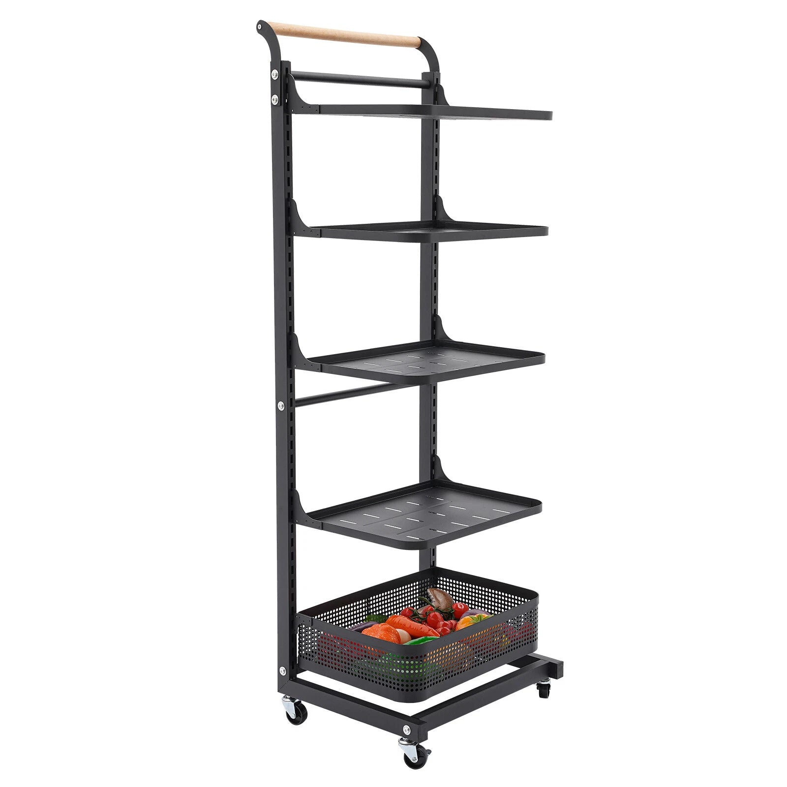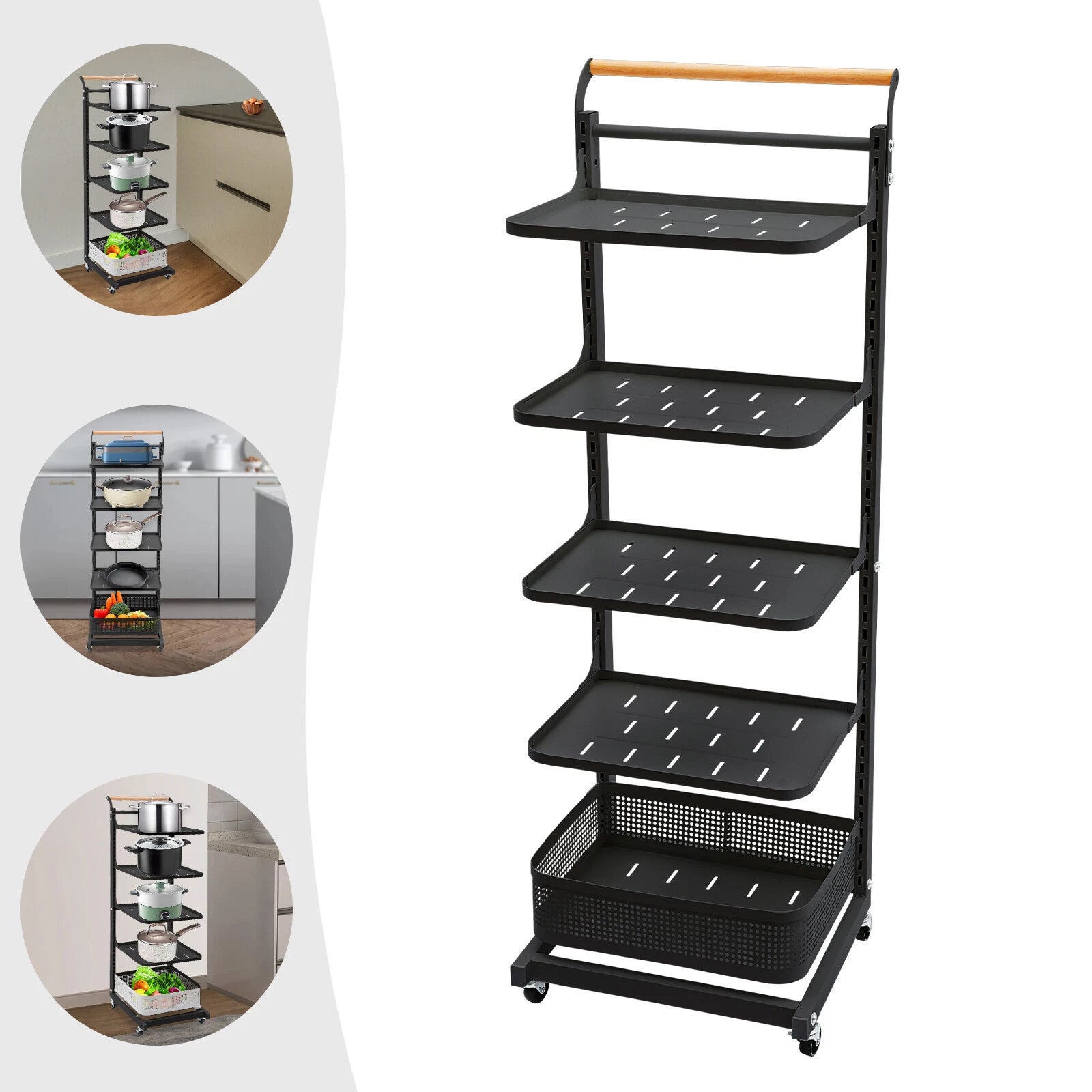 The 5-tier design allows customizable storage—each shelf's height can be adjusted via side clips to accommodate items of different sizes such as pots, pans, small appliances, or produce. -