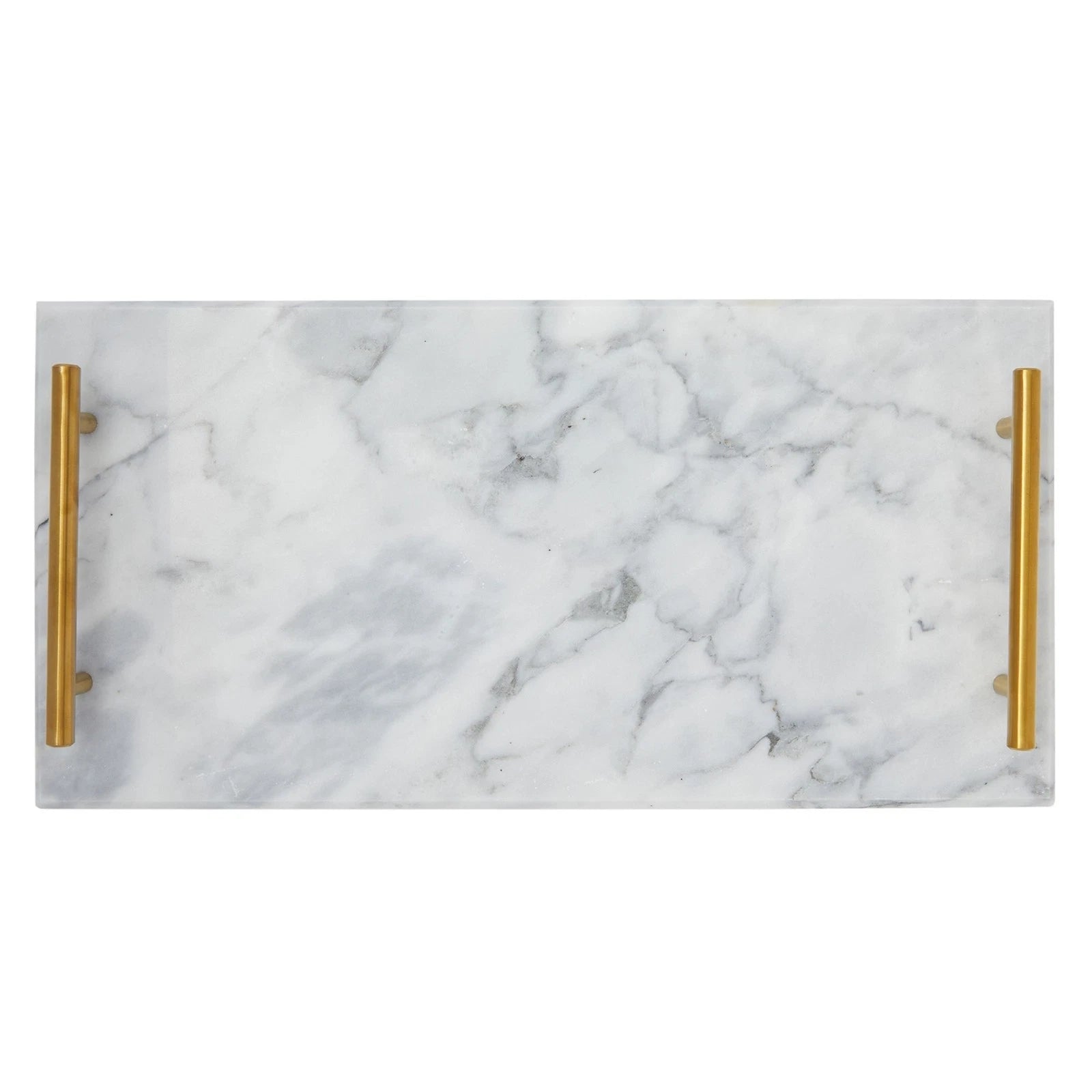 Crafted from high-quality natural marble, each tray showcases unique veining and subtle color variations for a truly one-of-a-kind look. The sturdy gold metal handles provide a secure grip, while felted tabs on the corners protect surfaces from scratches.