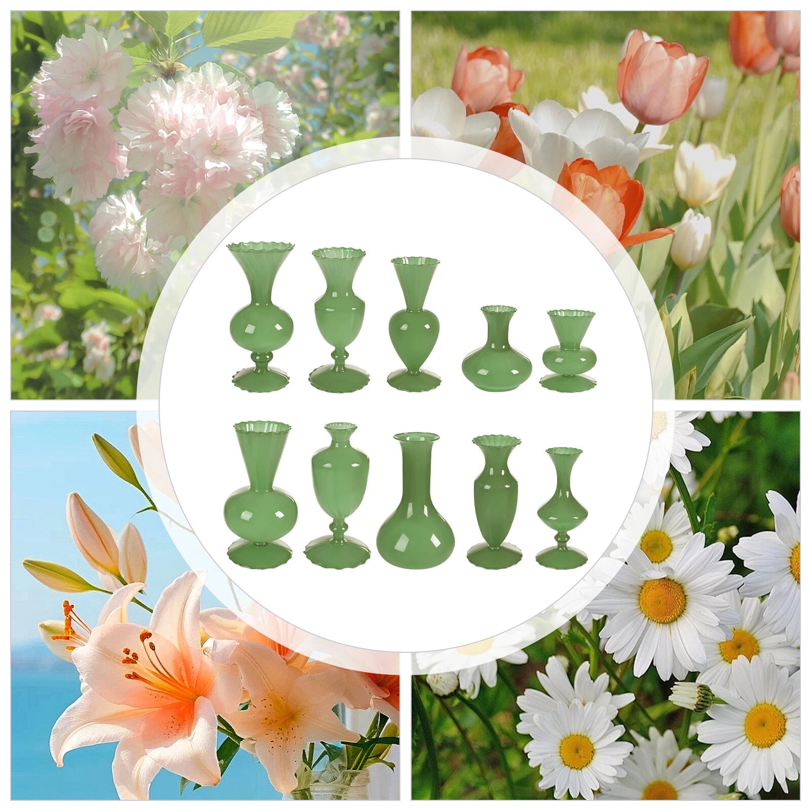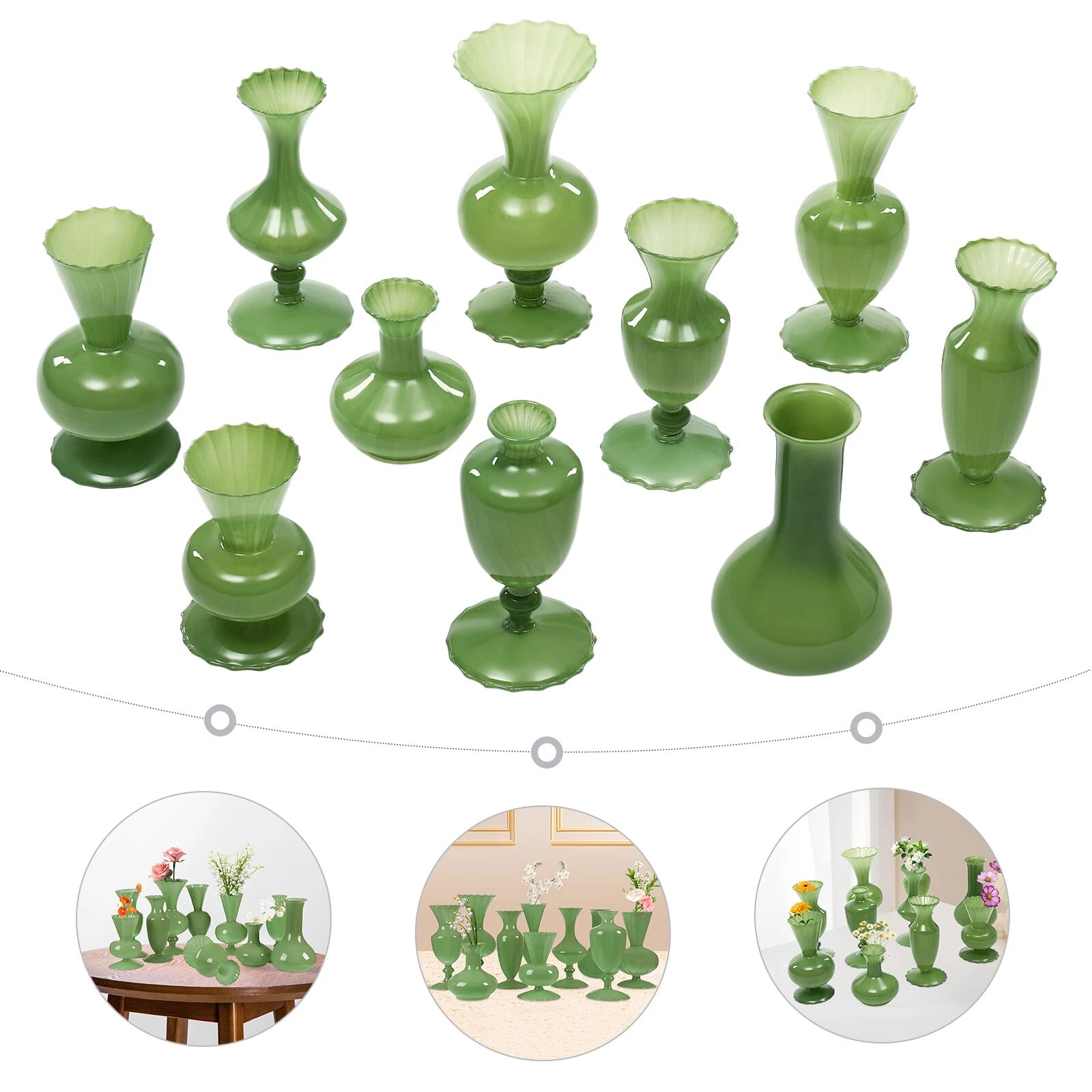 - Enhance your home or event decor with this set of 10 small green glass bud vases. Perfect for weddings, birthdays, graduations, or everyday decoration, these vases combine elegance with functionality.