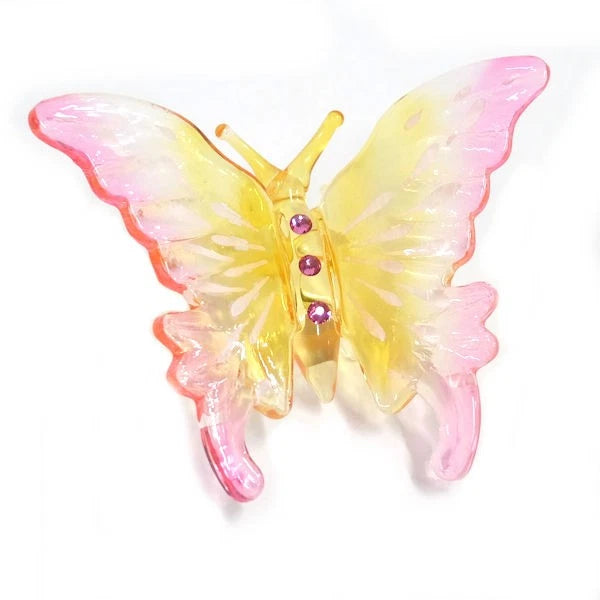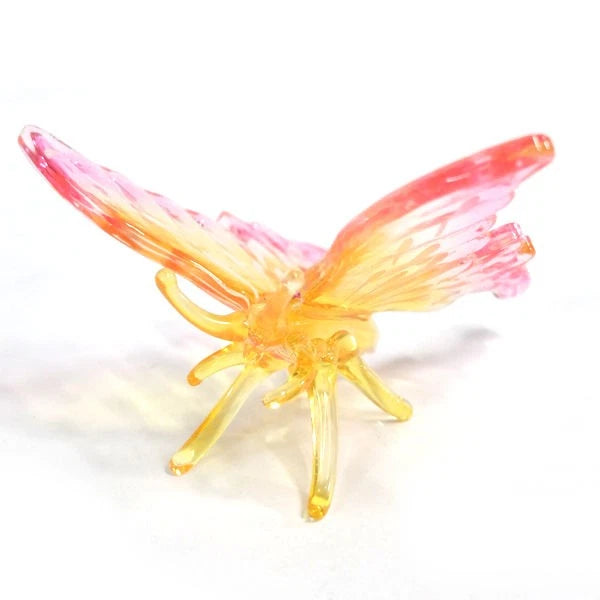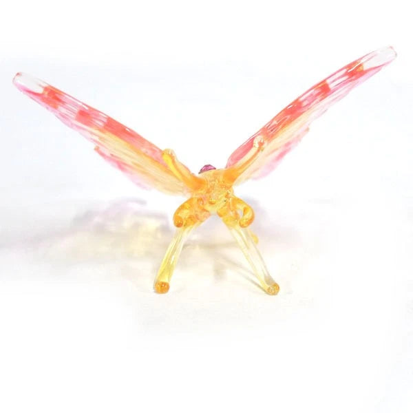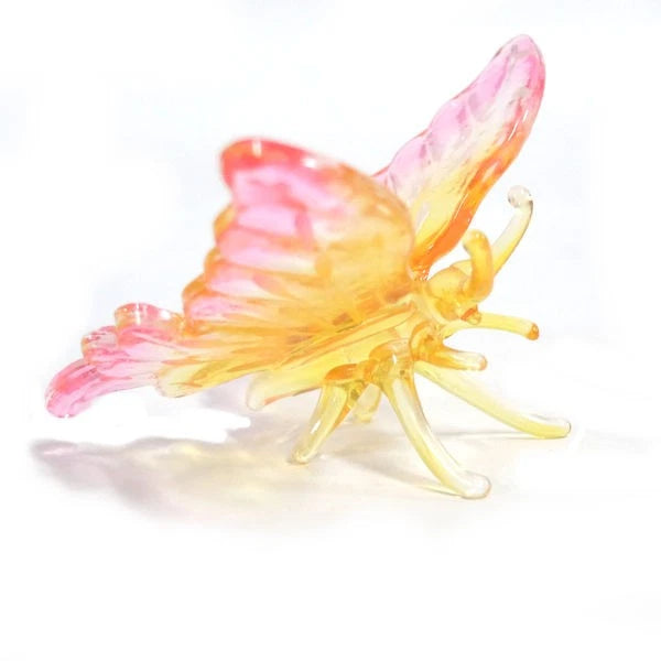 This delicate glass butterfly figurine is beautifully accented with sparkling Austrian crystals. Crafted in clear, pink, and yellow glass, it makes a charming addition to any figurine collection or a thoughtful gift for collectors.
