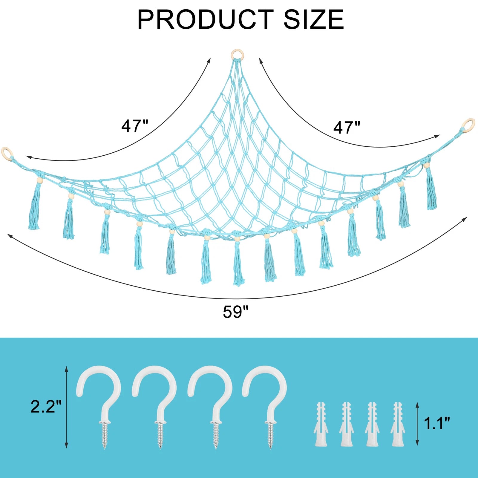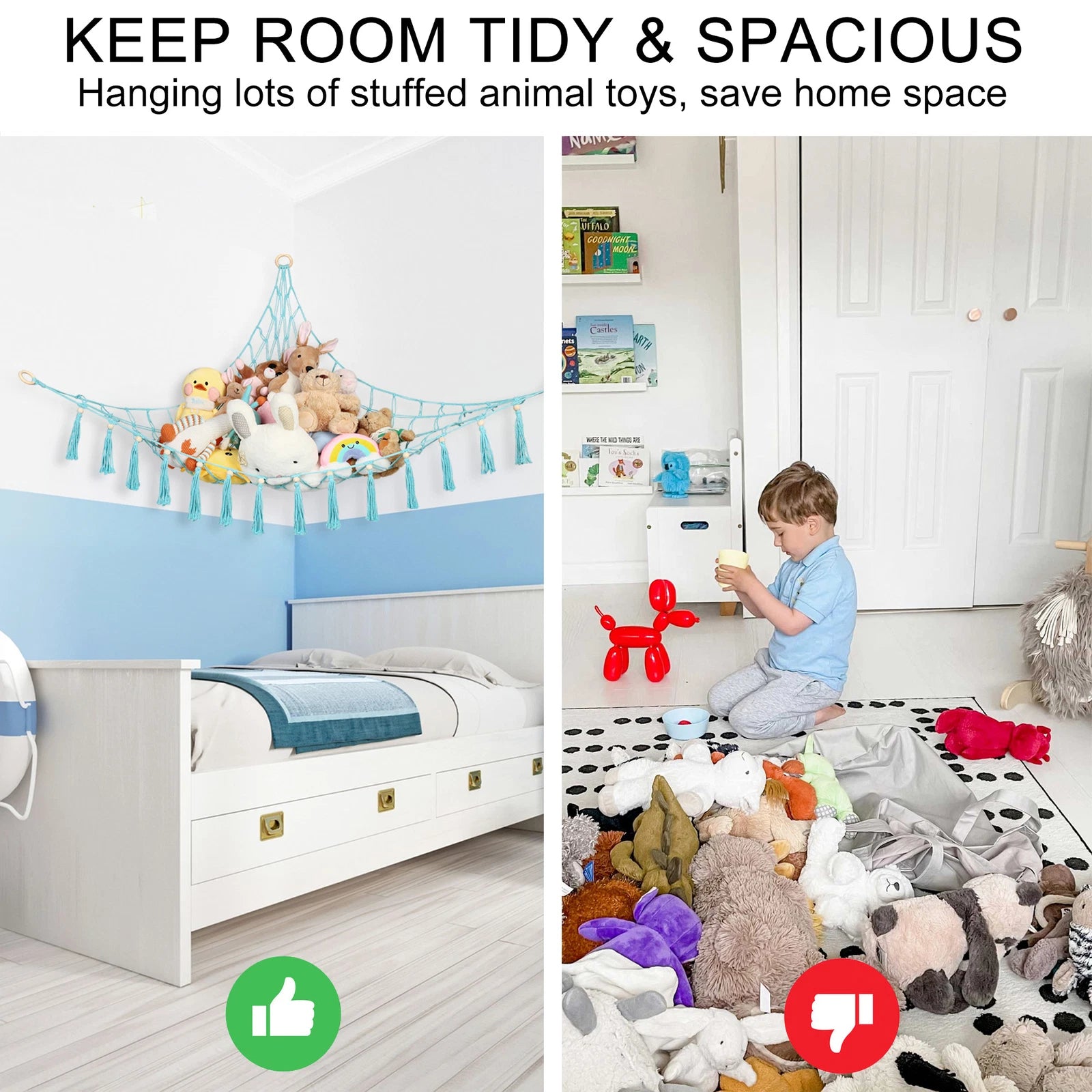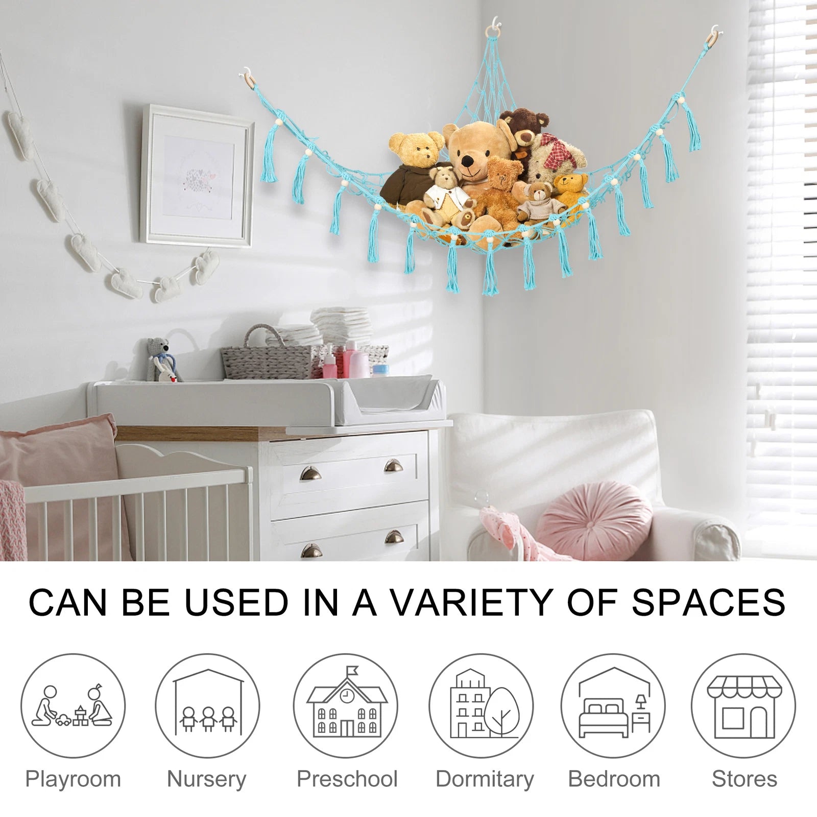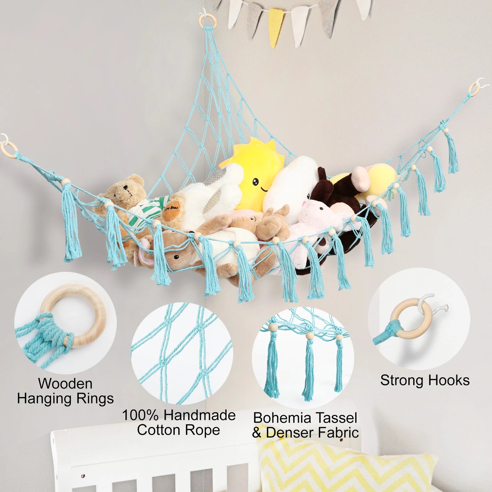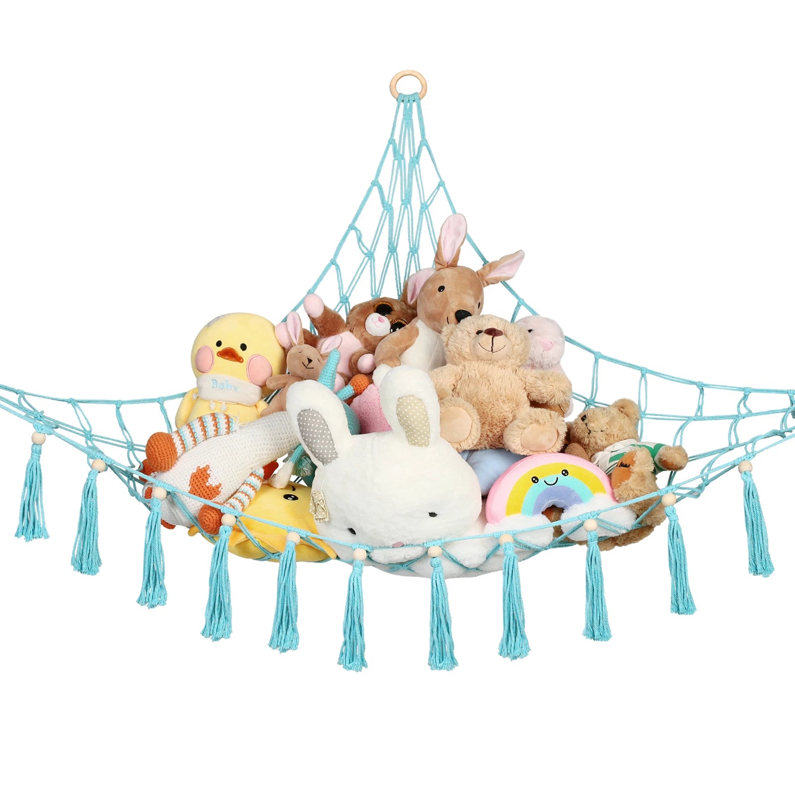 Keep your kids’ room organized with this durable and stylish toy hammock. Made from premium cotton rope with hand-woven craftsmanship, it safely stores stuffed animals, plush toys, dolls, blankets, and more. Its bohemian design with tassels and wooden bead accents adds charm while freeing up floor space.