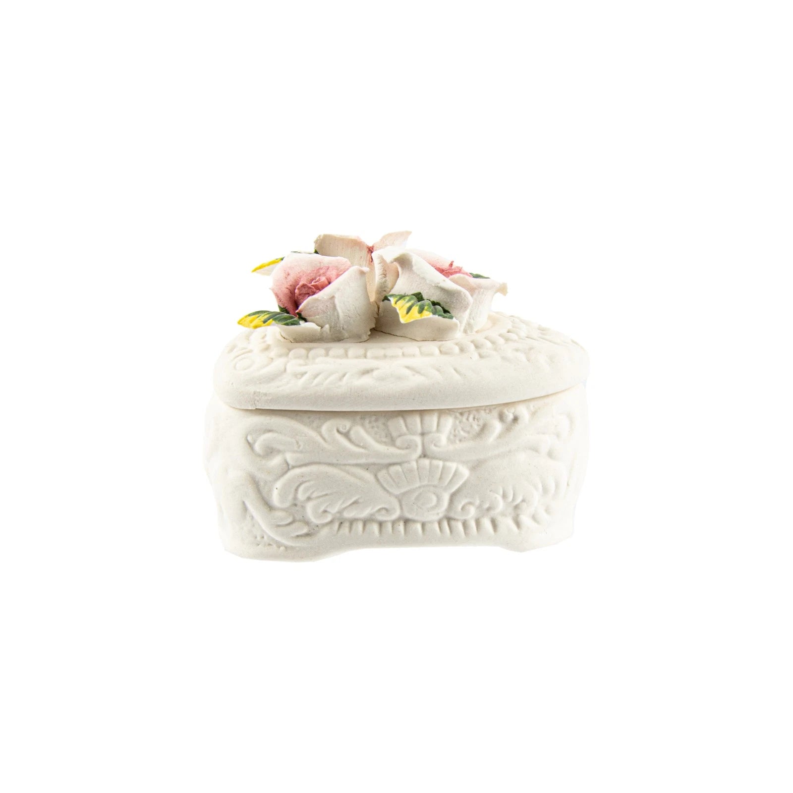 This charming vintage-inspired heart-shaped ceramic trinket box is topped with a sculpted rose lid for a delicate touch. Perfectly sized for rings, earrings, or other small keepsakes, it makes a thoughtful gift or an elegant addition to your dresser or vanity.