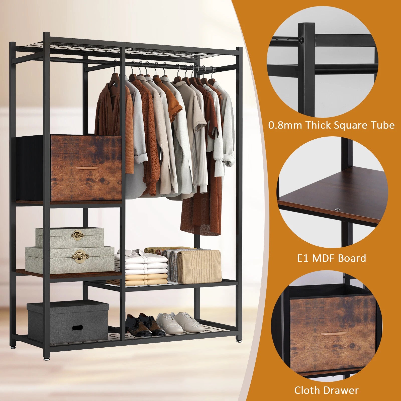 With a matte black metal frame and rustic brown shelving, this clothes rack combines functionality with a minimalist industrial aesthetic. It seamlessly complements a variety of interior styles and brings a modern edge to your space while enhancing organization.