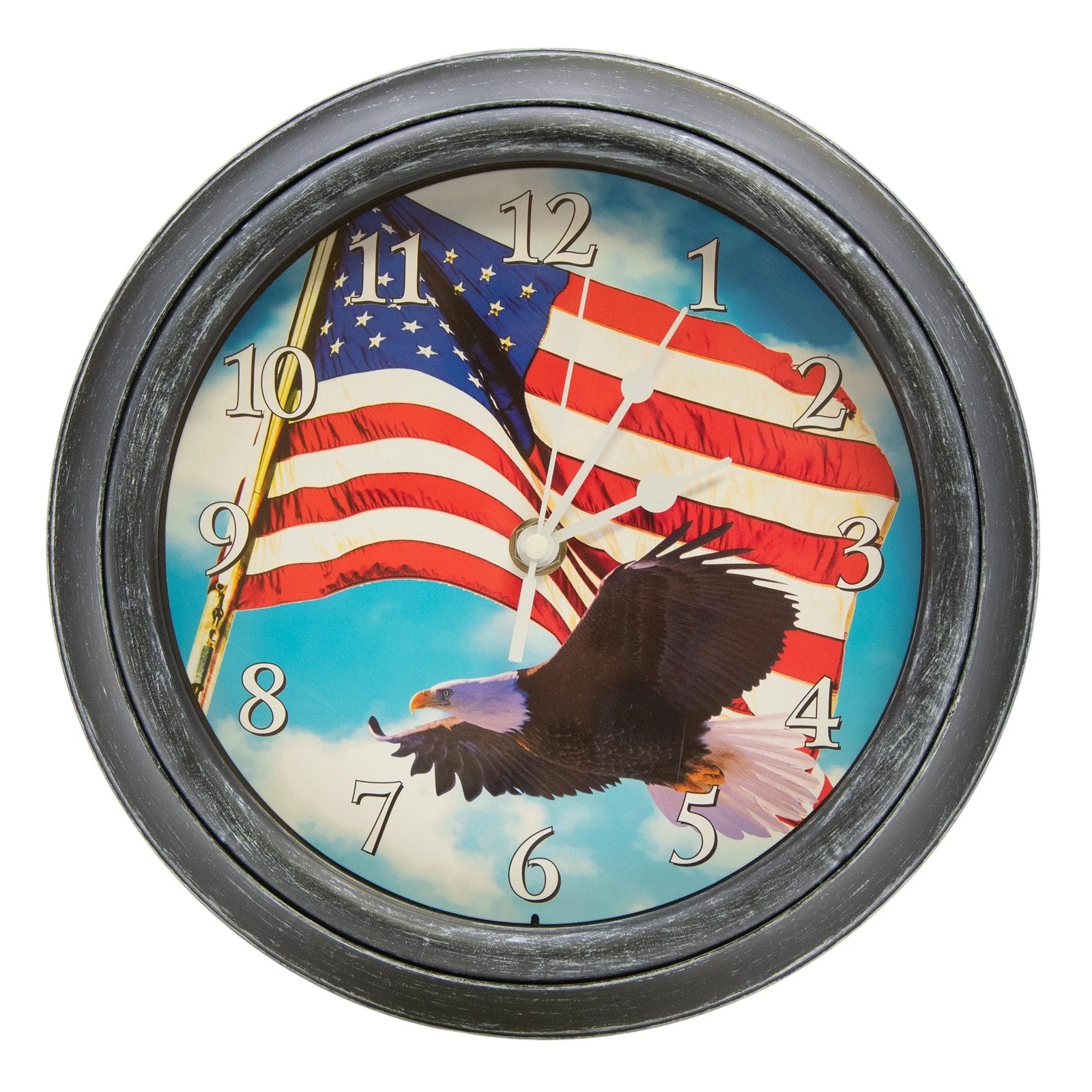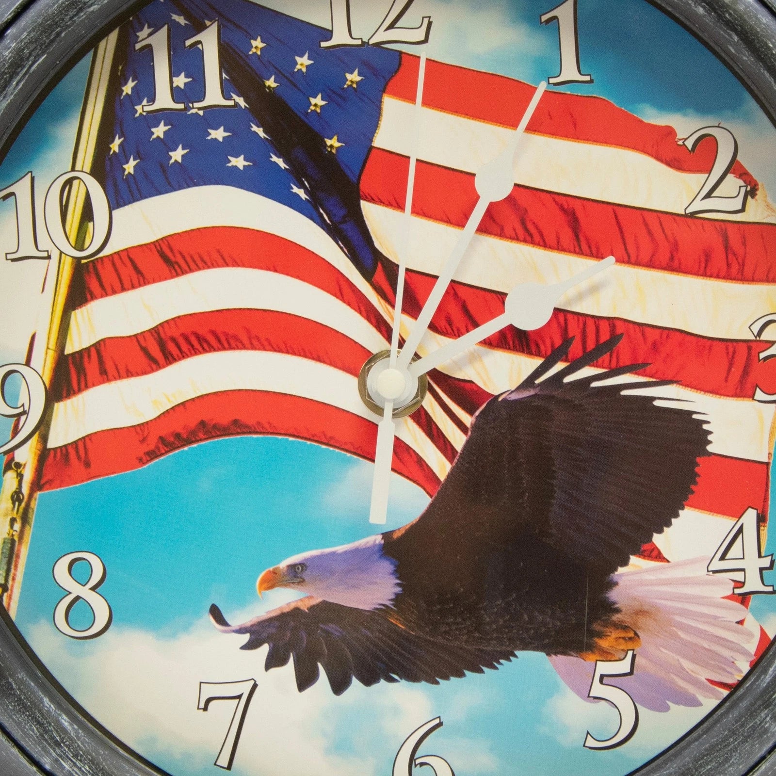 Show your patriotic spirit with this rustic-style wall clock featuring a soaring eagle and American flags on either side. The 9" quartz clock is battery-operated for convenient placement anywhere, making it a striking focal point for your home, office, or den.