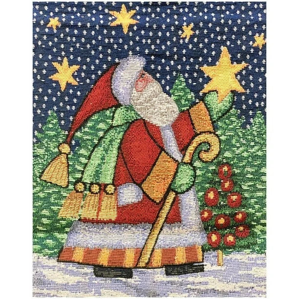 - Add festive charm to your home with this Santa Claus wall tapestry. Featuring Santa carrying a cane amidst stars and trees, this hangable tapestry comes with a sewn-in rod sleeve and wooden rod for easy display.