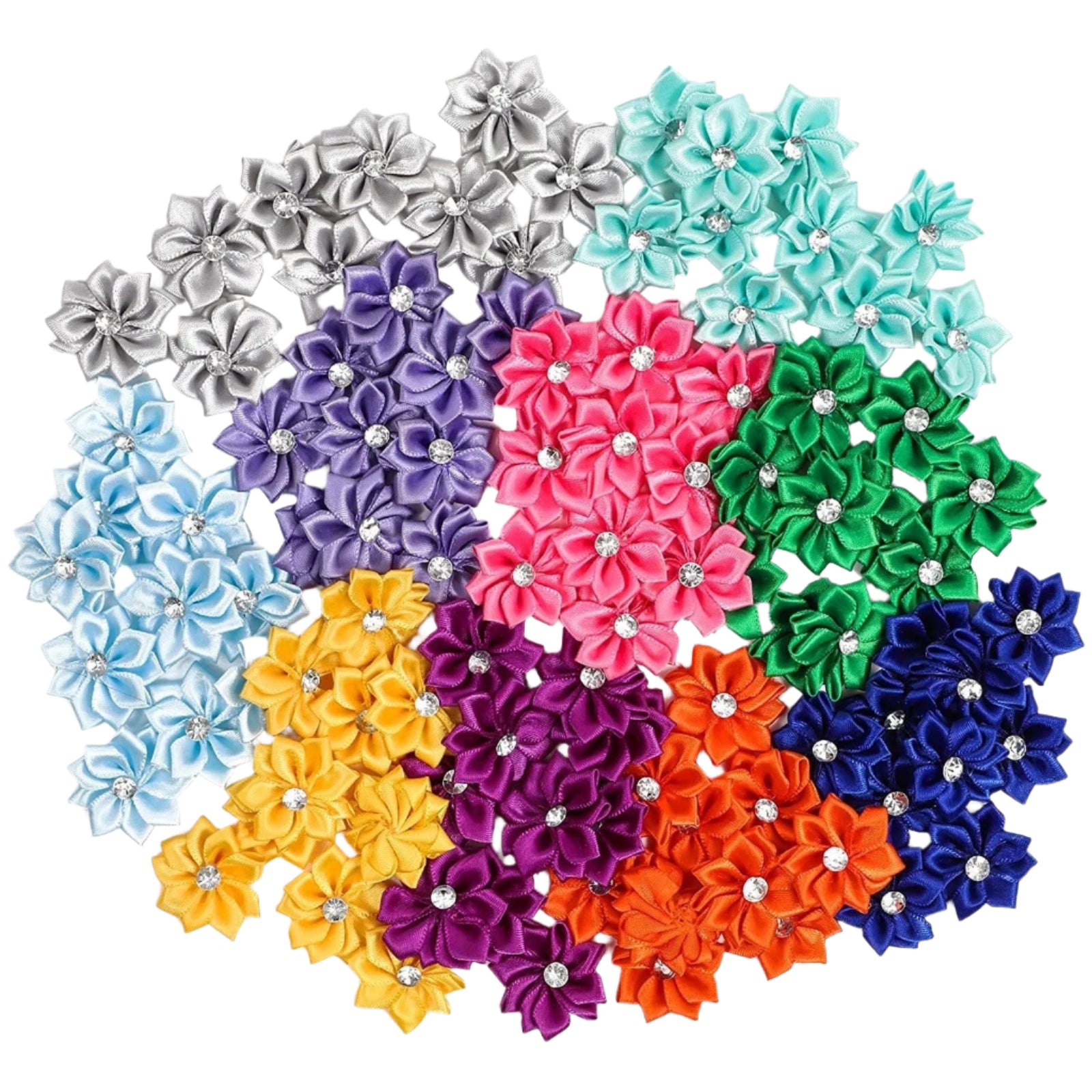 Add a charming and romantic touch to your crafts and décor with this 100-pack of satin ribbon daisy flower heads featuring dazzling rhinestone centers. These vibrant artificial daisies are crafted from high-quality polyester and available in 10 assorted colors, making them perfect for weddings, DIY projects, party decorations, scrapbooking, and more.