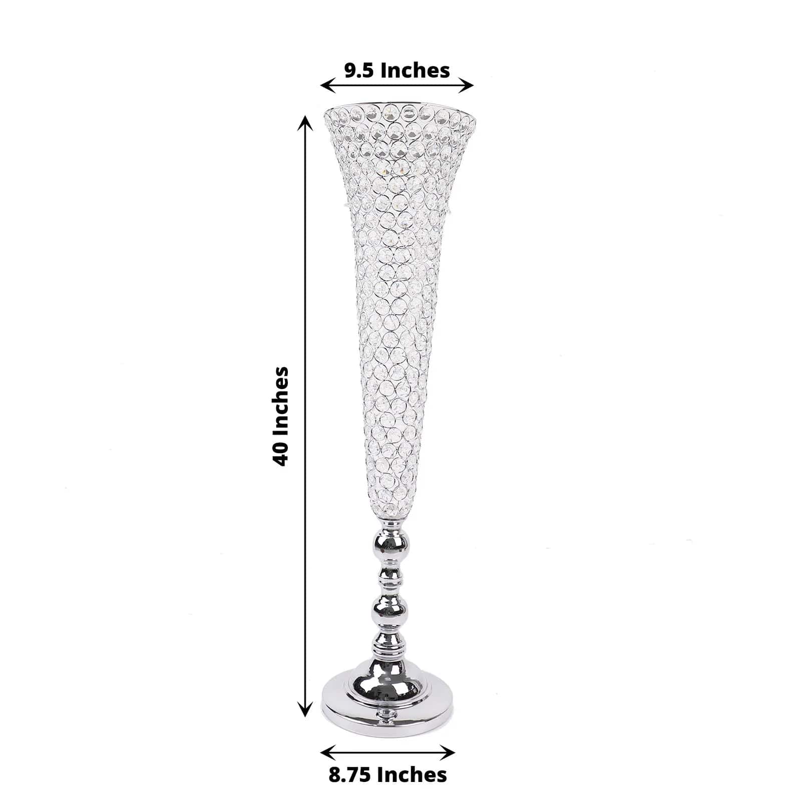 Elevate your event decor with this stunning set of two 40" tall silver metal trumpet vases adorned with dazzling acrylic crystal beads. Designed to make a grand statement, these vases are perfect for showcasing lavish floral arrangements and adding an elegant, glamorous touch to any tablescape. Whether used as wedding centerpieces, event decor, or eye-catching home accents, their towering height and sparkling embellishments create a sophisticated ambiance that will impress your guests.