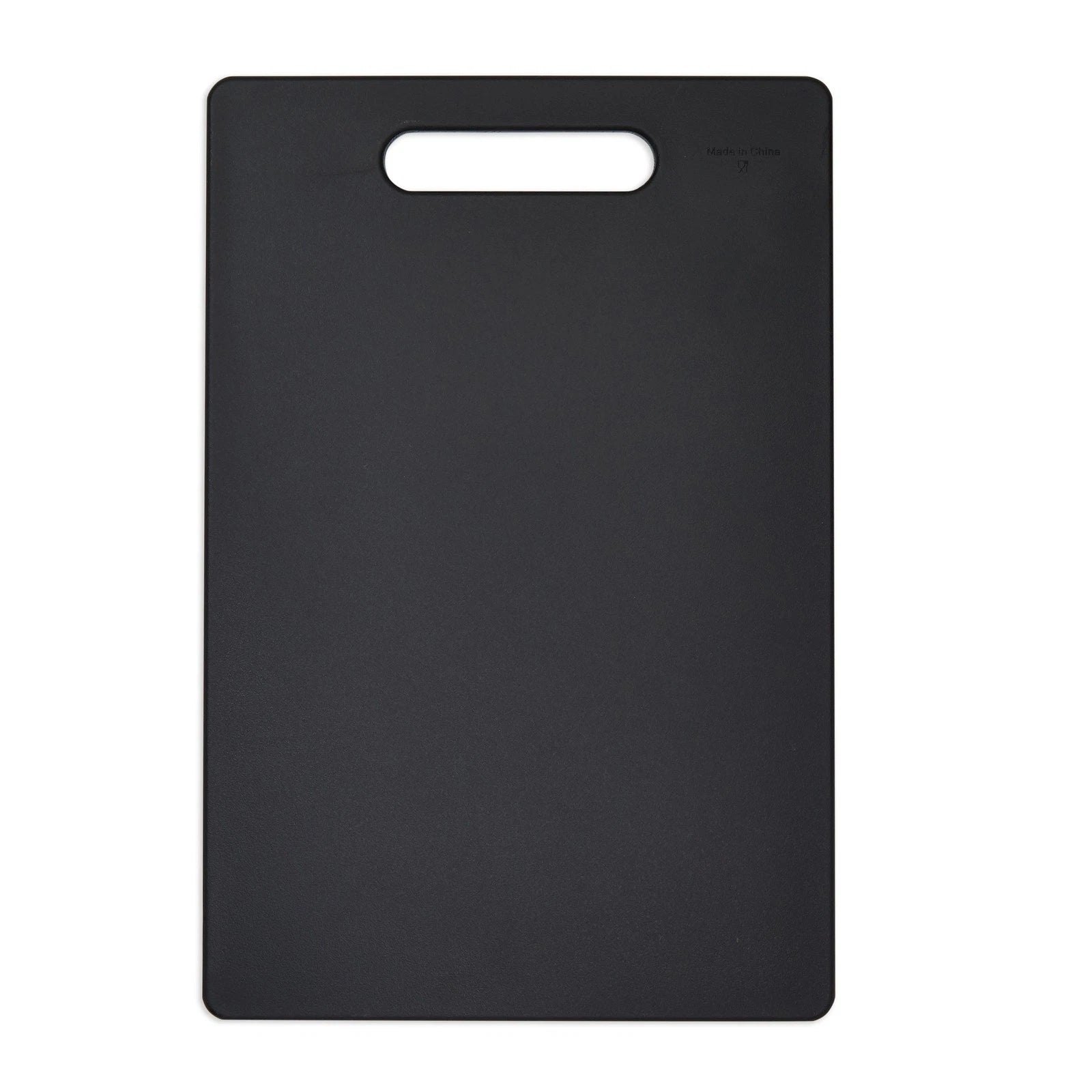 Each black plastic cutting board measures 7.75 x 11.6 inches and features a top hand grip for convenient hanging and storage.