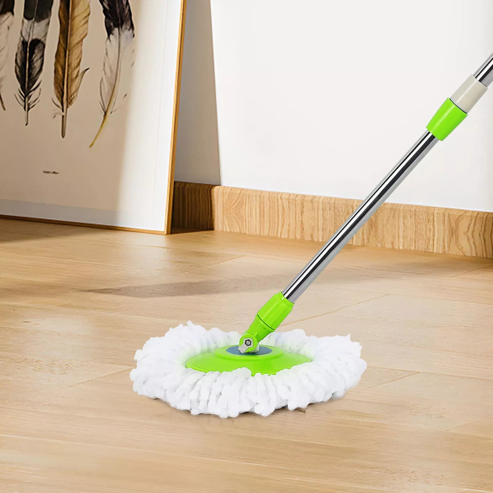 The handle features a twist-and-release locking system for adjustable length and ease of use. The 360° swivel mop head reaches under furniture and into tight corners effortlessly. -